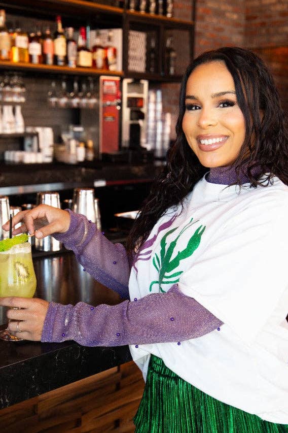 Add a little shimmer to your look with our Mock Neck Mesh Top, Purple Shimmer.